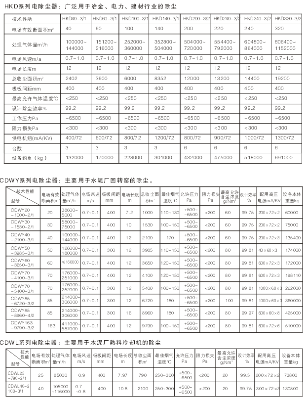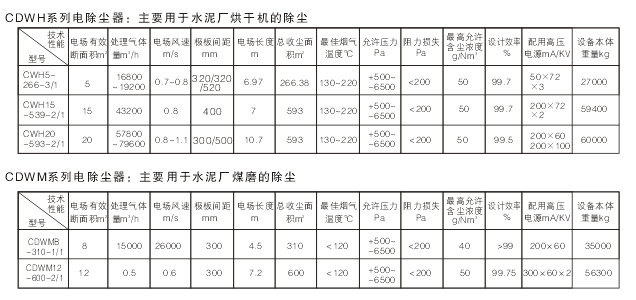 各種規格的電除塵器性能參數見下表:
